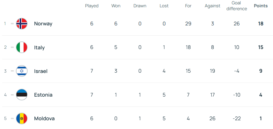 Norway 18 points (6 games played), Italy 15 points (6), Israel 9 points (7), Estonia 4 points (7), Moldova 1 (6)