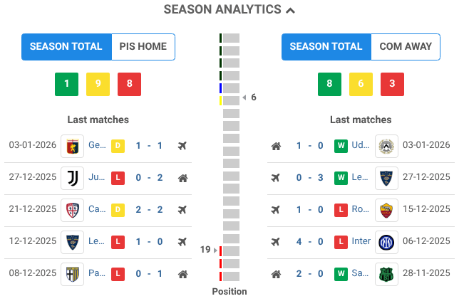 Pisa faced a home loss at the Arena Garibaldi – Stadio Romeo Anconetani. This was a significant win for Como, who temporarily climbed to fourth place with 33 points, tying with Juventus and Roma, but leading on goal difference. Pisa performed well for more than an hour, but they faltered after going behind and squandered a prime chance to get back in the game with Nzola. Gilardino’s squad remains at the bottom of the standings and will be playing away in Udine in the next round.