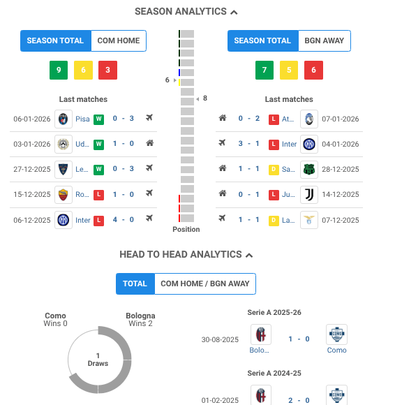Como vs Bologna Official Lineups, Saturday 10 January 2026, Serie A Week 20