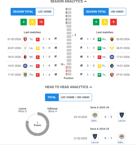 Lecce triumphed at the Via del Mare Stadium. This win brings Lecce to 21 points, placing them in 17th position, just 3 points ahead of Fiorentina, who have 18 points. Udinese stays at 32 points, holding the 9th position. In the 5th minute, Lecce took the lead thanks to Gandelman, who was quick to pounce on a loose ball in the box and scored past Okoye. Oumar Solet then stepped up to take a penalty for Udinese, successfully converting it to level the score at 1-1. Finally, in the 90th minute, Lecce secured the win when Banda curled a free-kick over the wall, beating Okoye for a final score of 2-1.