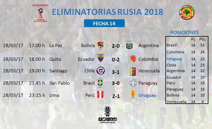 Here are the FIFA World Cup Qualifiers Results of the CONMEBOL on Tuesday 28 March 2017. Brazil with 33 points, mathematically speaking, already qualified for the 2018 FIFA World Cup in Russia.