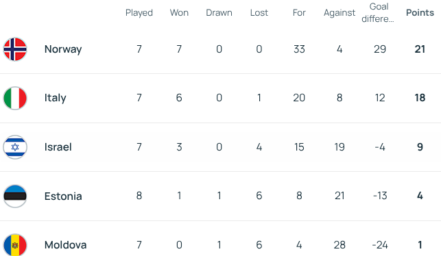 Group I Standings: Norway, 21 points (seven games played), ITALY, 18 points (seven), Israel, nine points (seven), Estonia, four points (eight), Moldova, one point (seven).