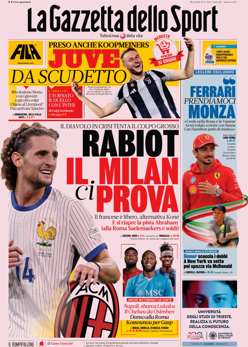 ✅ Greetings, my friends! I present to you the latest front pages from the Italian newspapers La Gazzetta dello Sport, Corriere dello Sport, and Tutto Sport, dated Wednesday 28 August 2024.