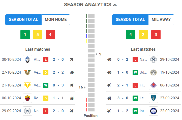 Milan has experienced at least three losses in their first nine matches of a Serie A season for the first time since the 2019/20 season, where they faced five defeats but managed to win their 10th game. Recently, they have lost two out of their last three league matches (with one win) against Fiorentina and Napoli, matching the number of defeats they had in their previous 11 games (which included four wins and five draws).
