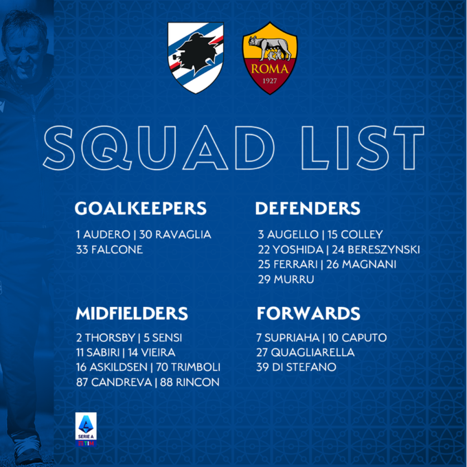 ✅ Here are Sampdoria official called up players by Coach Marco Giampaolo for the Serie A Week 31 game Sampdoria vs AS Roma on Sunday 3 April 2022 at the Luigi Ferraris Stadium in Genoa, Italy at 18:00.