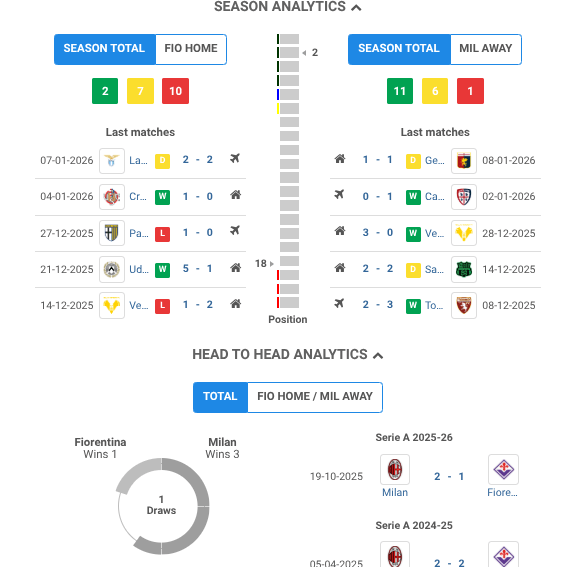 Fiorentina vs AC Milan Official Lineups, Sunday 11 January 2026, Serie A Week 20