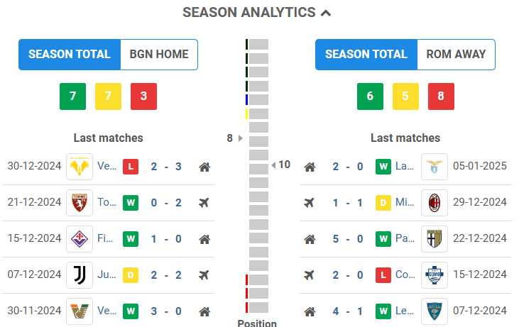 On the other hand, Roma has secured three victories in their last five league matches (1 draw, 1 loss), matching their total from the previous 15 Serie A games (3 wins, 4 draws, 8 losses). They are aiming for back-to-back league wins for the first time since last September, when they defeated Udinese and Venezia. However, Roma has struggled away from home, remaining winless in their last 12 Serie A away games (6 draws, 6 losses). This marks their longest winless streak on the road since the period from April 1998 to March 1999, when Zdenek Zeman was the coach, during which they went 15 matches without a win (7 draws, 8 losses).