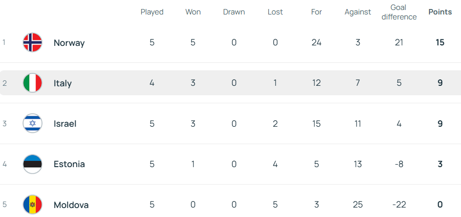 Norway 15 points (5 games played), Italy 9 (4), Israel 9 (5), Estonia 3 (5), Moldova 0 (5)