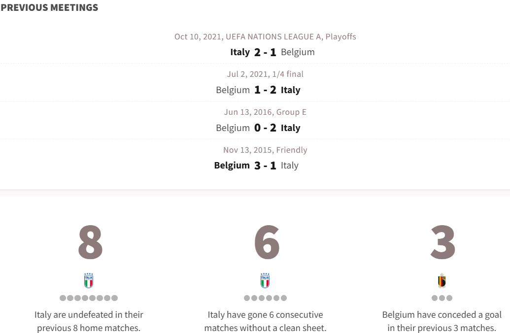 Italy have won five of the last six meetings against Belgium (L1), including all three most recent ones – scoring twice as many goals as the Red Devils in the period (12 vs 6).