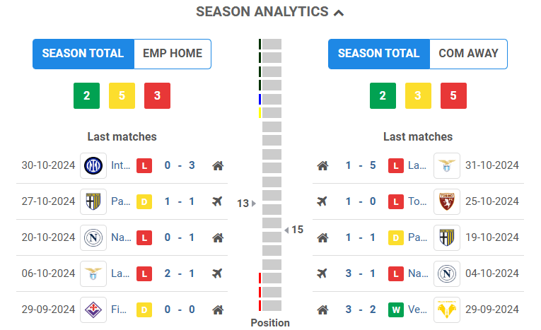 Empoli has faced setbacks recently, losing three out of their last four league matches, with one draw included. This equals the number of defeats they had in their previous 14 Serie A games.  Empoli managed five wins, six draws, and three losses. On the other hand, Como has struggled as well, securing just one point over the last four matchdays in Serie A, with one draw and three losses. In October, this performance ranked among the three worst in the league, matching the one point earned by both Empoli and Genoa.