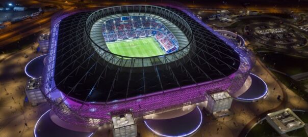 Built on the site of the Al Rayyan Sports Club’s former stadium, the venue is adjacent to the Mall of Qatar and within walking distance of Al Riffa station on the Doha Metro’s Green Line. The stadium’s most striking feature is a glowing façade, comprised of patterns that characterise different aspects of Qatar: the importance of family, the beauty of the desert, native flora and fauna, and local and international trade. A fifth shape – a shield – brings together all the others, representing the strength and unity that are particularly relevant to the desert city of Al Rayyan.