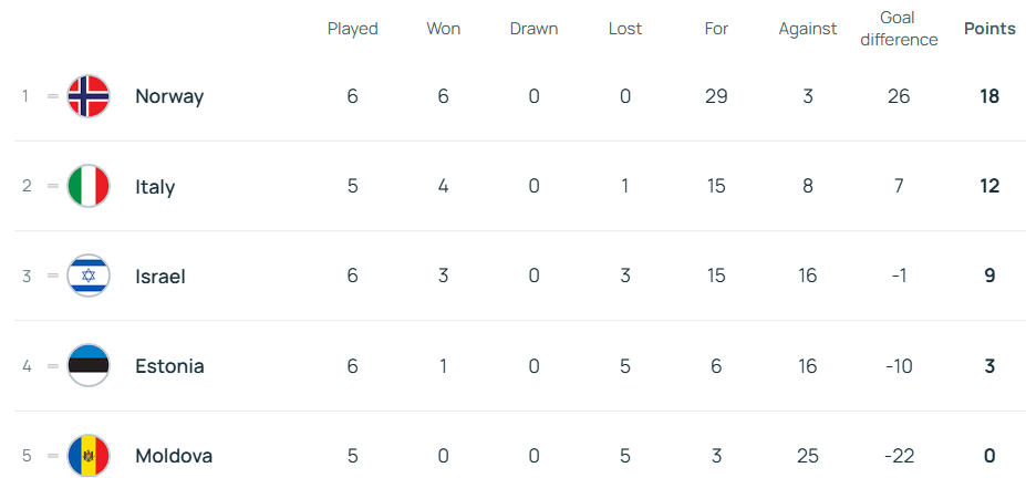 Norway 18 points (6 games played), Italy 12 (5), Israel 9 (6), Estonia 3 (6), Moldova 0 (5)
