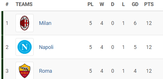 - 👉 What can we anticipate in the Serie A Week 6 round? Currently, there are 3 teams at the top, each with 12 points: AC Milan, Napoli, and Roma. This indicates that we could see a new leader emerge, or the current leadership might stay unchanged. At this moment, AC Milan has put an end to Napoli’s winning streak. Both Milan and Napoli have 12 points. However, Milan leads the table due to a goal difference of +6, while Napoli is in 2nd place with a goal difference of +5. Roma also has 12 points but a goal difference of 12. Let’s not overlook Juventus, who is closely trailing in 4th place with 11 points. Anything can happen.