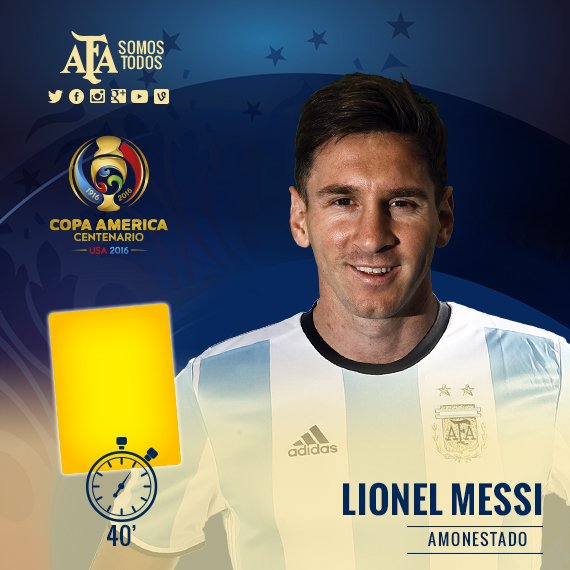 Things seeming to get out of control. Referee giving a yellow card to Argentina forward Lionel Messi for a diving in the 40th minute.
