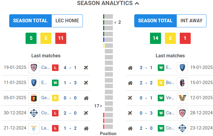 Recently, Inter has been on a roll, winning their last five league games against Lecce, netting at least two goals in each match (12 goals total, averaging 2.4 per game) and maintaining a clean sheet in the last four. On the other hand, Lecce has struggled at home against Inter, winning just once in their last eight Serie A matches at the Via del Mare (3 draws, 4 losses), with their only victory being a 1-0 win on January 29, 2012, thanks to Guillermo Giacomazzi’s goal under coach Serse Cosmi.