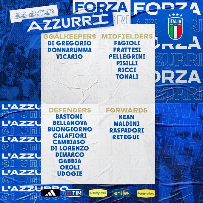 Midfielders: Nicolò Fagioli (Juventus), Davide Frattesi (Inter), Lorenzo Pellegrini (Roma), Niccolò Pisilli (Roma), Samuele Ricci (Torino), Sandro Tonali (Newcastle);