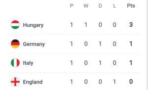 After Matchday 1, Italy stand third place with 1 point same as Germany. Hungary lead in the 1st position with 3 points and England in the last position without points.