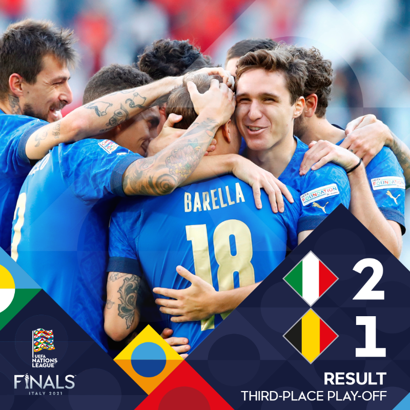 Goals: .47′ Nicolò Barella (I), 65′ Domenico Berardi (pen)(I), 86′ Charles De Ketelaere (B)