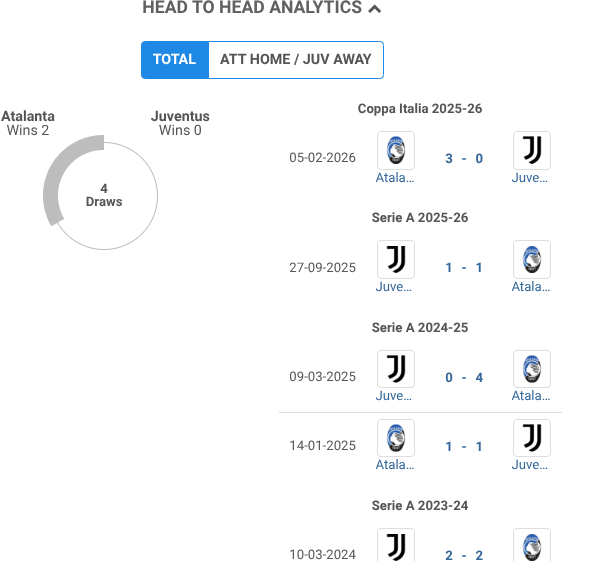 Atalanta Wins 24 Draws Juventus Wins 0 |