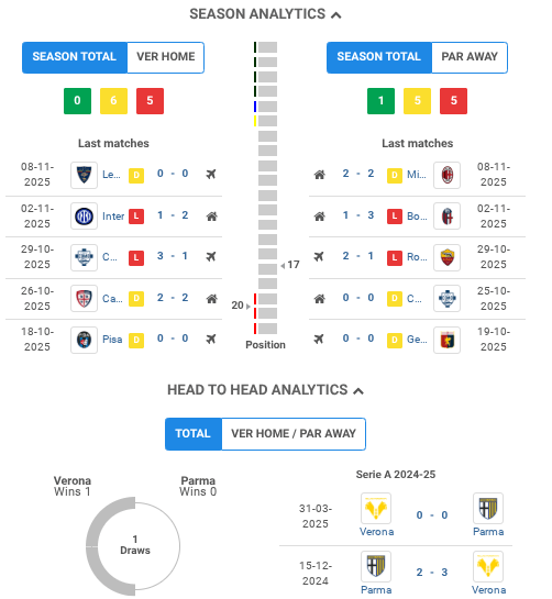 In the league standings, Verona is now tied with Fiorentina at the bottom with six points, while Parma has climbed to 11 points.