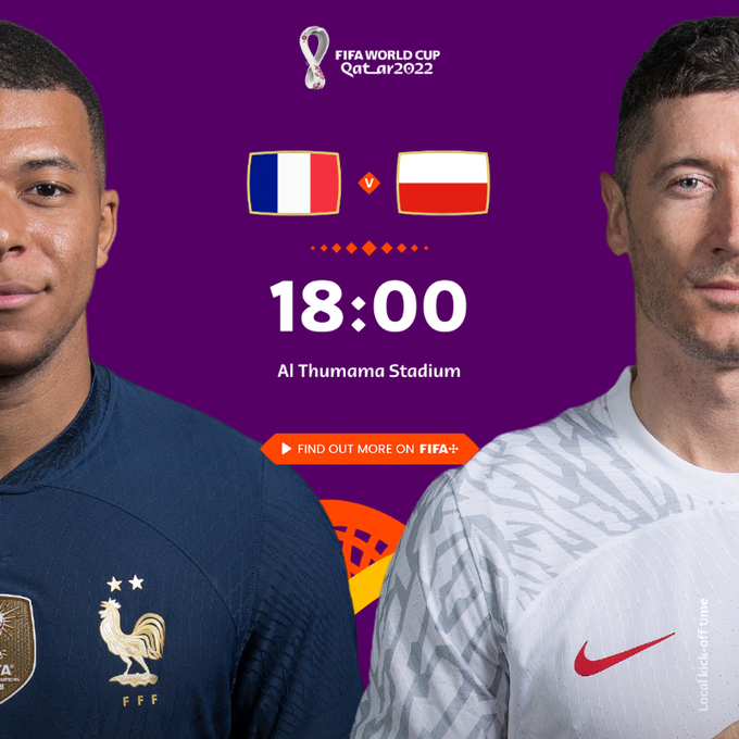 🏆👉 France dominated and convincingly won the FIFA World Cup Round of 16 defeating Poland on Sunday 4 December 2022 at the Al Thumama Stadium in Al Thumama, Qatar. Practically, France easily gets rid of Poland and got their pass to the Quarterfinals to face the winner of the challenge between England and Senegal. France, after finishing the first half ahead by a goal thanks to Olivier Giroud, spread on the counterattack in the second half with Kylian Mbappé, able to exploit the large spaces allowed by the Polish formation and score a sumptuous brace that ends the match prematurely. In fact, the goal from the penalty spot scored by Poland captain Robert Lewandowski just seconds from the end of the match was useless. This is the second meeting between France and Poland at the World Cup: the previous one dates back to the third-place play-off in the 1982 tournament – a 3-2 win for Poland.
