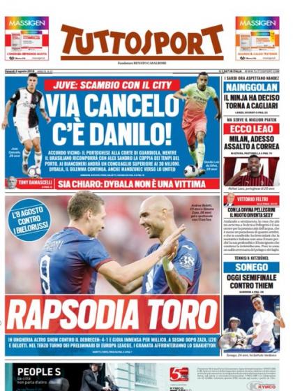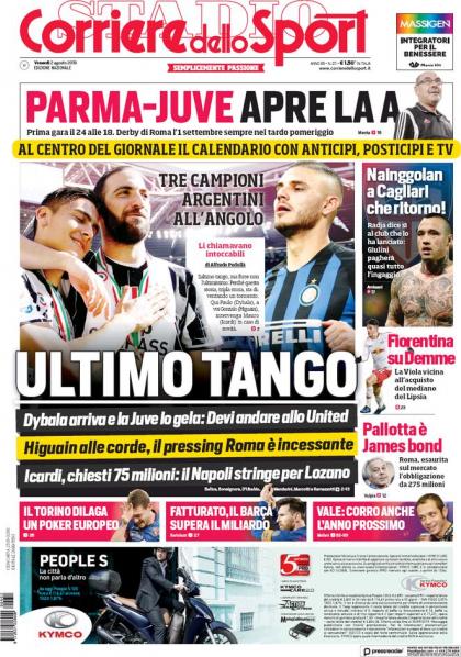 Here are the front pages from the Italian newspapers La Gazzetta dello Sport, Corriere dello Sport, and Tutto Sport, Friday 2 August, 2019.