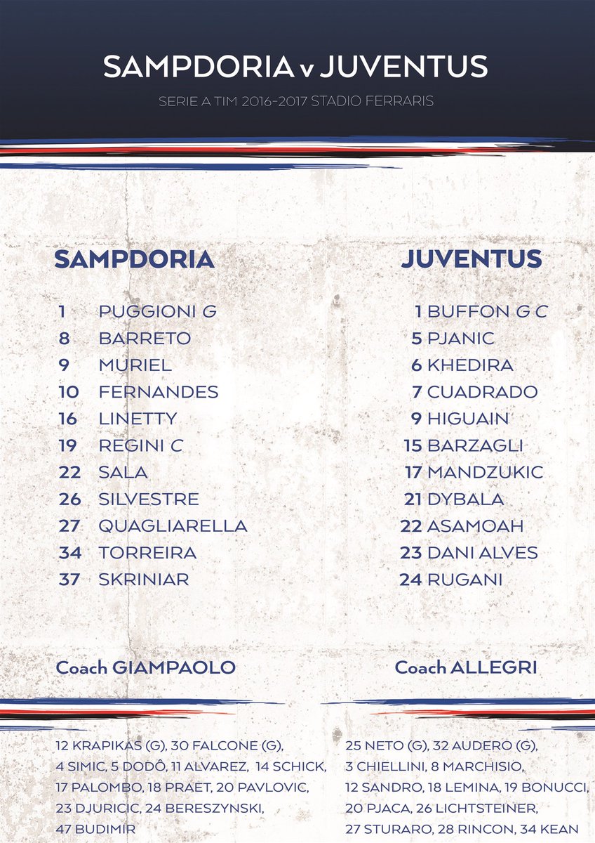 Here are SAMPDORIA vs JUVENTUS official starting lineups -formations for the Serie A Week 29 game on Sunday 19 March 2017 at the Luigi Ferraris Stadium in Genoa, Italy at 15:00.