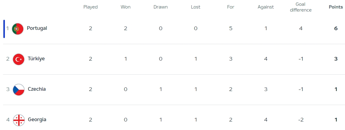 Portugal crushed Turkey and won the UEFA EURO 2024 Group Stage Group F Matchday 2 game on Saturday 22 June 2024. The victory gave Portugal the qualification to the Round of 16 as GroupF winners. The three goals scored by Bernardo Silva with his first goal at a major tournament, an own goal from Samet Akaydin and a goal by Bruno Fernandes. Turkey still have chance for qualification if they defeat on Wednesday the Czech Republic, who drew 1-1 with Georgia.