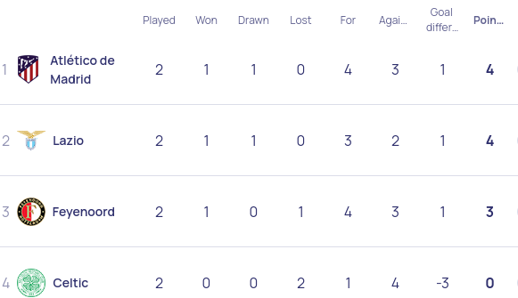 Third matchday in three weeks: Celtic will host Atletico Madrid while Lazio will visit Feyenoord.