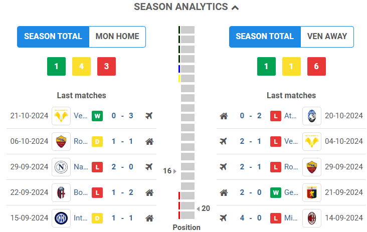 Monza, 16th position with 7 points and a negative goal difference of -1