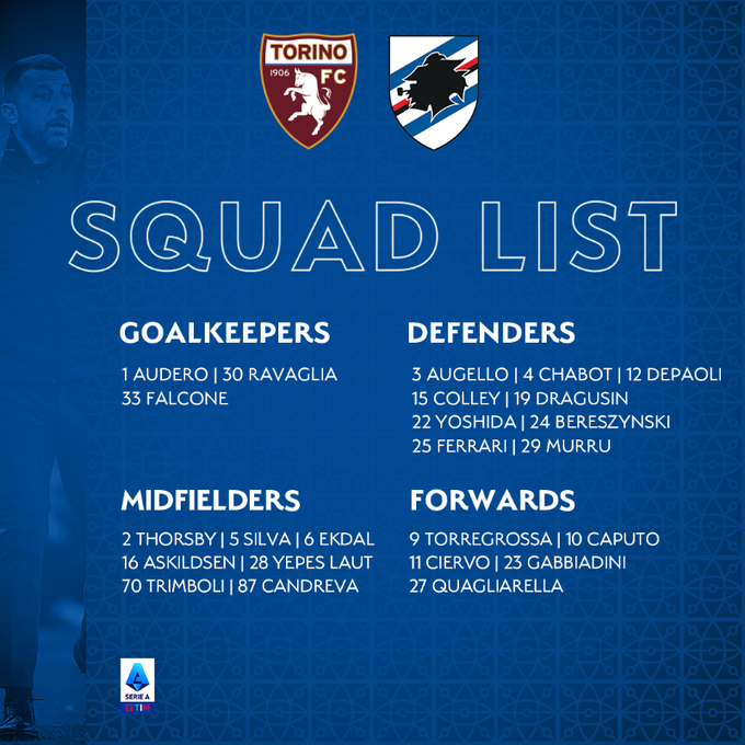 ✅ Here are Torino official called up players by Coach Ivan Juric for the Serie A Week 11 game Torino vs Sampdoria on Saturday 30 October 2021 at the Olimpico Torino Stadium in Turin, Italy at 20:45.