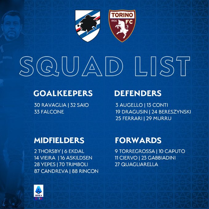 ✅ Here are Sampdoria official called up players by Coach Roberto D’Aversa for the Serie A Week 22 game Sampdoria vs Torino on Saturday 15 January 2022 at the Luigi Ferraris Stadium in Genoa, Italy at 15:00.