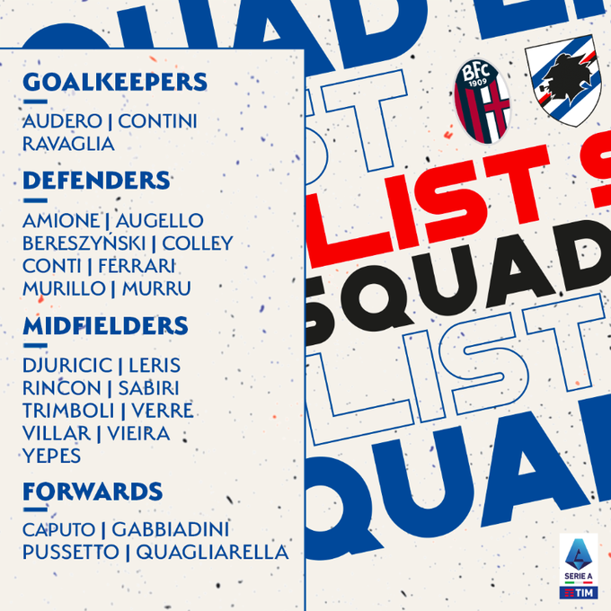 ✅ Here are Sampdoria official called up players by Coach Dejan Stanković for the game against Bologna: