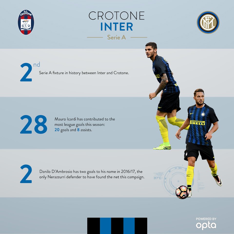 - There are no precedents between Crotone vs Inter at the Adriatico Stadium. Crotone is playing in the Serie A for the first time in their history. The only precedent is at the Giuseppe Meazza Stadium in the 12th round seeing Inter 3 – 0 Crotone.