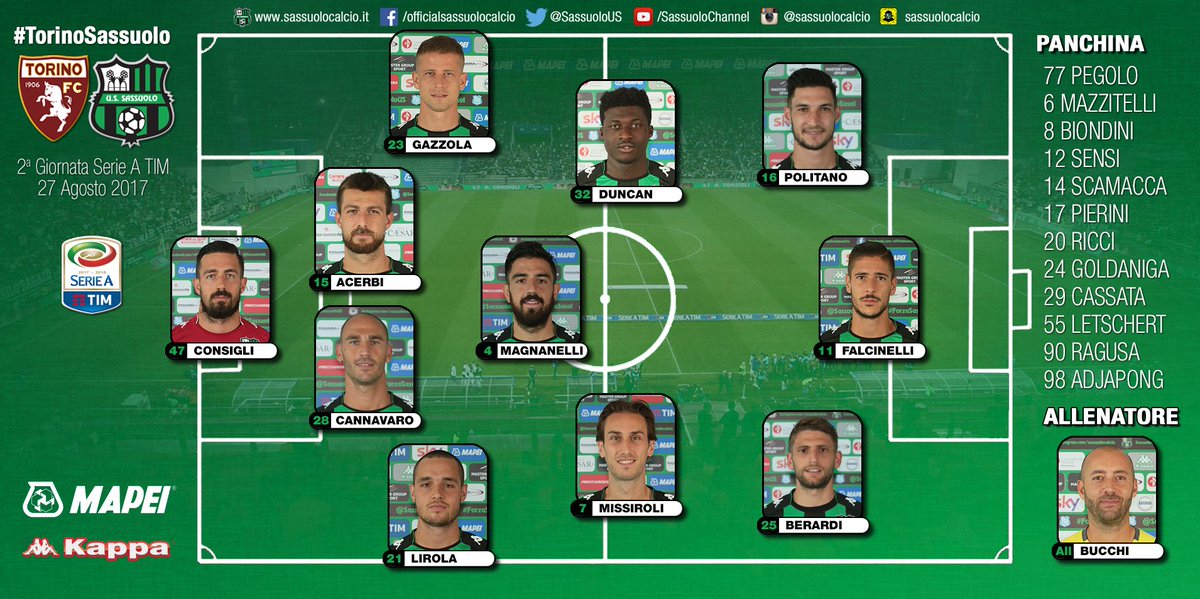 Sassuolo (4-3-3): Consigli; Lirola, Cannavaro, Acerbi, Gazzola; Missiroli, Magnanelli, Duncan; Berardi, Falcinelli, Politano.
